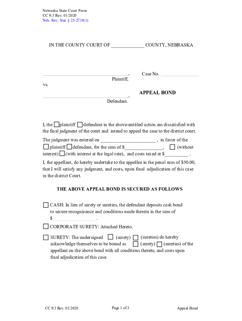 This document is an appeal bond used in the Nebraska County Court for an appellant dissatisfied with the court\'s final judgment and intending to appeal to the district court.