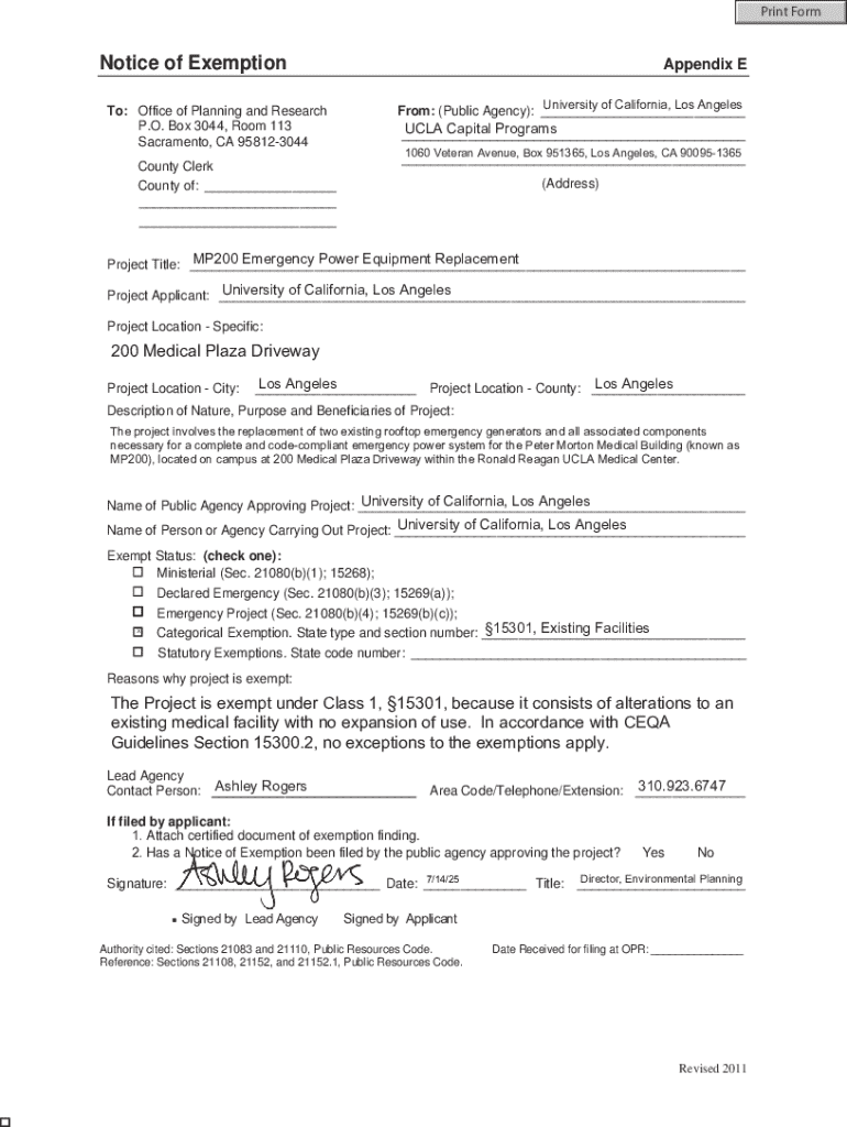 This document serves as a notice for exemption regarding the replacement of emergency power equipment at UCLA, detailing the project\'s nature, purpose, and compliance with environmental regulations.