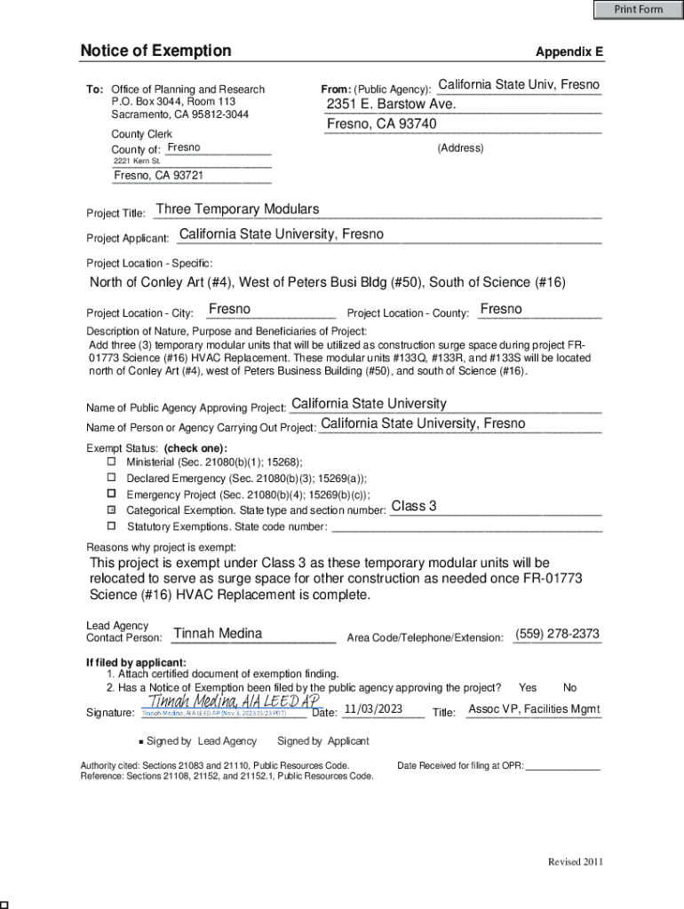 This document serves to notify the Office of Planning and Research regarding the approval of an exemption for a project involving the addition of temporary modular units for construction surge space.