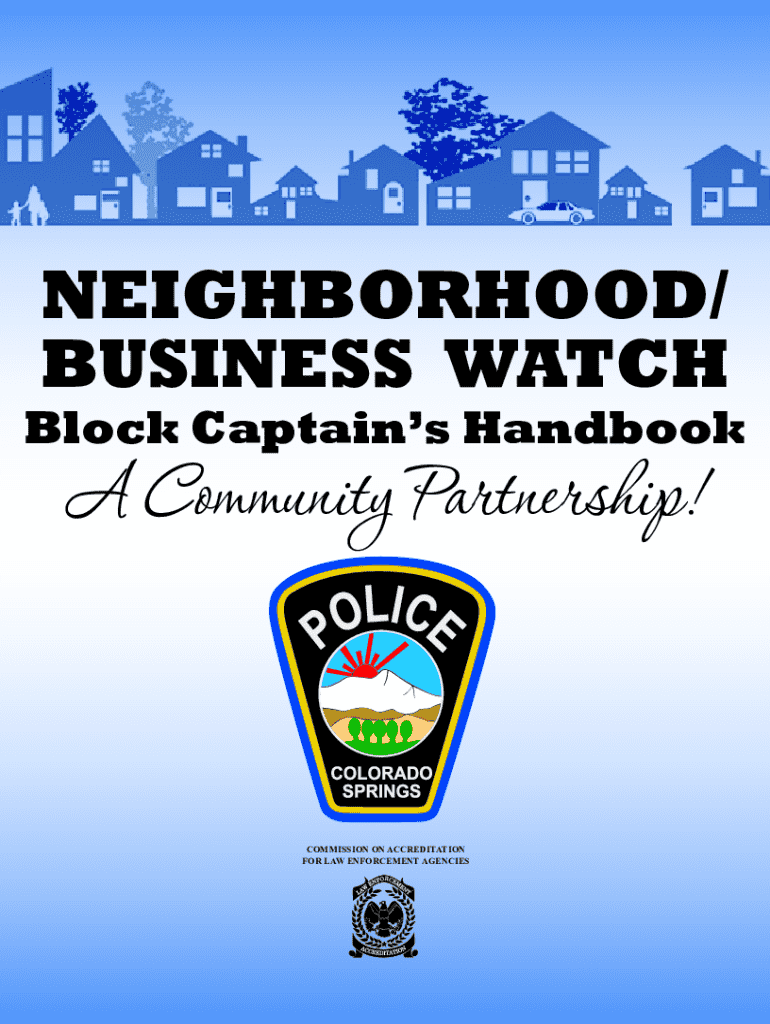 This handbook serves as a guide for Block Captains involved in the Colorado Springs Police Department Neighborhood Watch Program, outlining community crime prevention strategies, responsibilities,