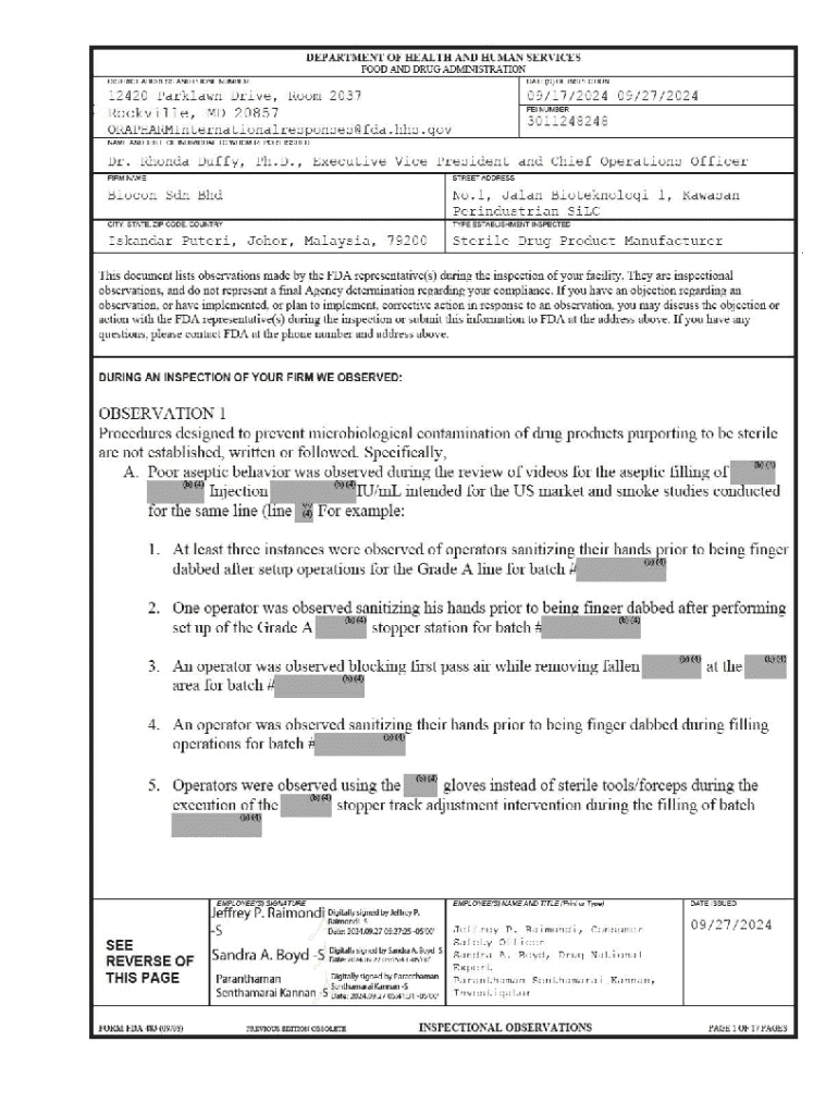FDA Form 483 consists of several critical sections that outline specific observations made during an inspection. The primary focus is on documenting instances of non-compliance or potential violations, and each section plays a distinct role in conveying this information.