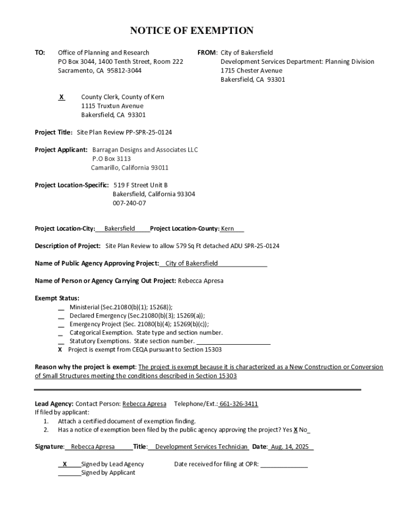 This document serves as a notice of exemption for the Site Plan Review PPSPR250124 related to a detached ADU in Bakersfield.
