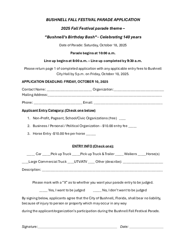 Filing the Bushnell Fall Festival Parade form is a crucial step for those wishing to participate or contribute to the event. This form serves multiple purposes, primarily ensuring that all entries are organized, safe, and compliant with event standards. Without it, the parade committee cannot assess the variety of floats, performances, or community groups intending to join the celebration.