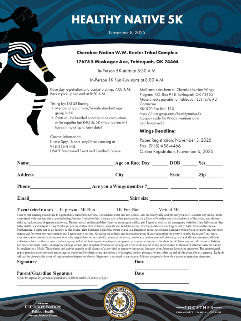 Filling out the Healthy Native 5k form is a vital step for participants. The form serves as a gateway to participation while gathering essential information for event planners. By collecting accurate data, organizers can ensure a smooth experience for all runners and their supporters. The form also establishes a link between participants and the event's health initiatives.