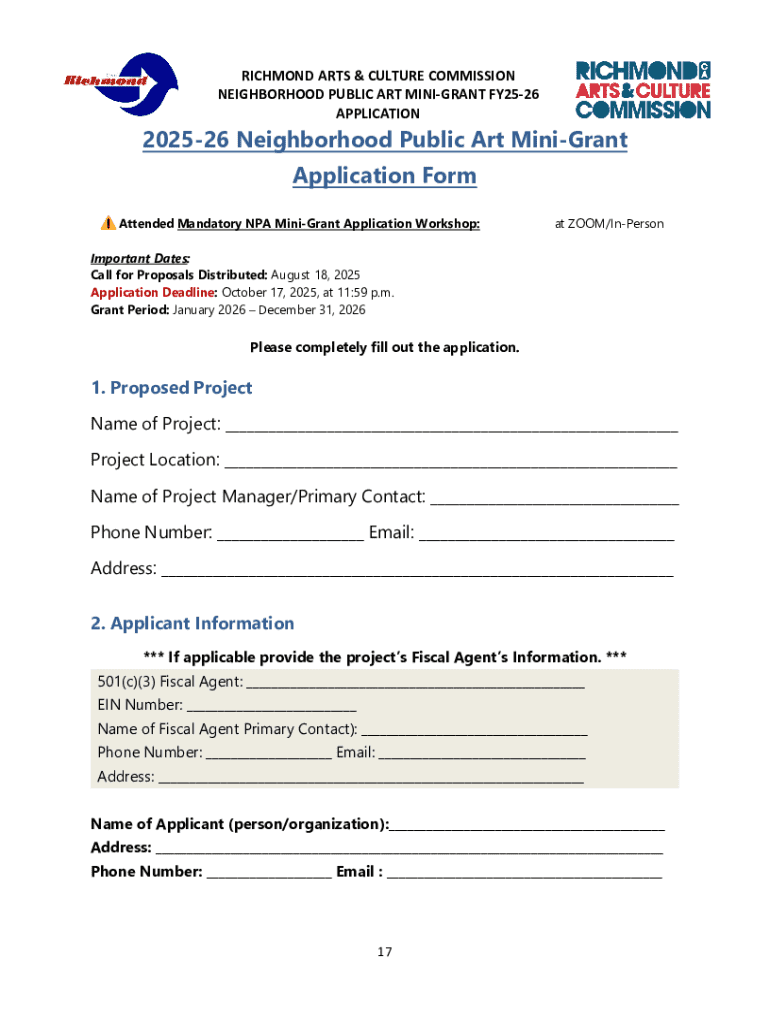 This document serves as an application form for the Richmond Arts & Culture Commission\'s Neighborhood Public Art MiniGrant for the fiscal year 20252026, providing instructions on how to apply and