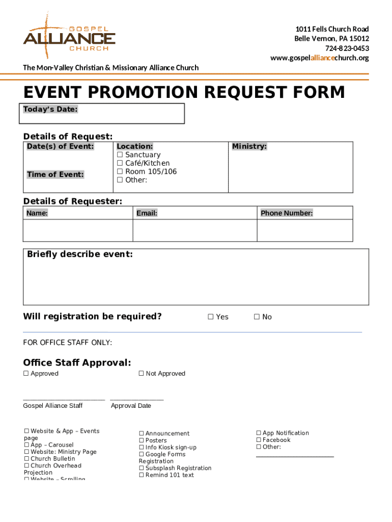 Before starting to fill out Event Promotion Request MS Word form, ensure that you have prepared all the information required. That's a mandatory part, as far as errors may cause unpleasant consequences beginning from re-submission of the entire word template and completing with missing deadlines and you might be charged a penalty fee. You have to be really careful filling out the digits. At first glance, you might think of it as to be not challenging thing. However, it is easy to make a mistake. Some people use some sort of a lifehack keeping everything in another file or a record book and then add this information into documents' sample. Nonetheless, come up with all efforts and provide accurate and genuine information in your Event Promotion Request word template, and doublecheck it when filling out all fields. If you find any mistakes later, you can easily make amends when working with PDFfiller editor and avoid blown deadlines.