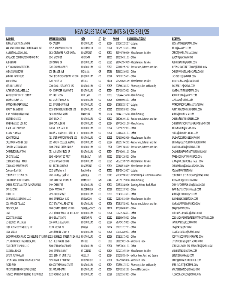 Get the free New Sales Tax Accounts 8/1/25-8/31/25
