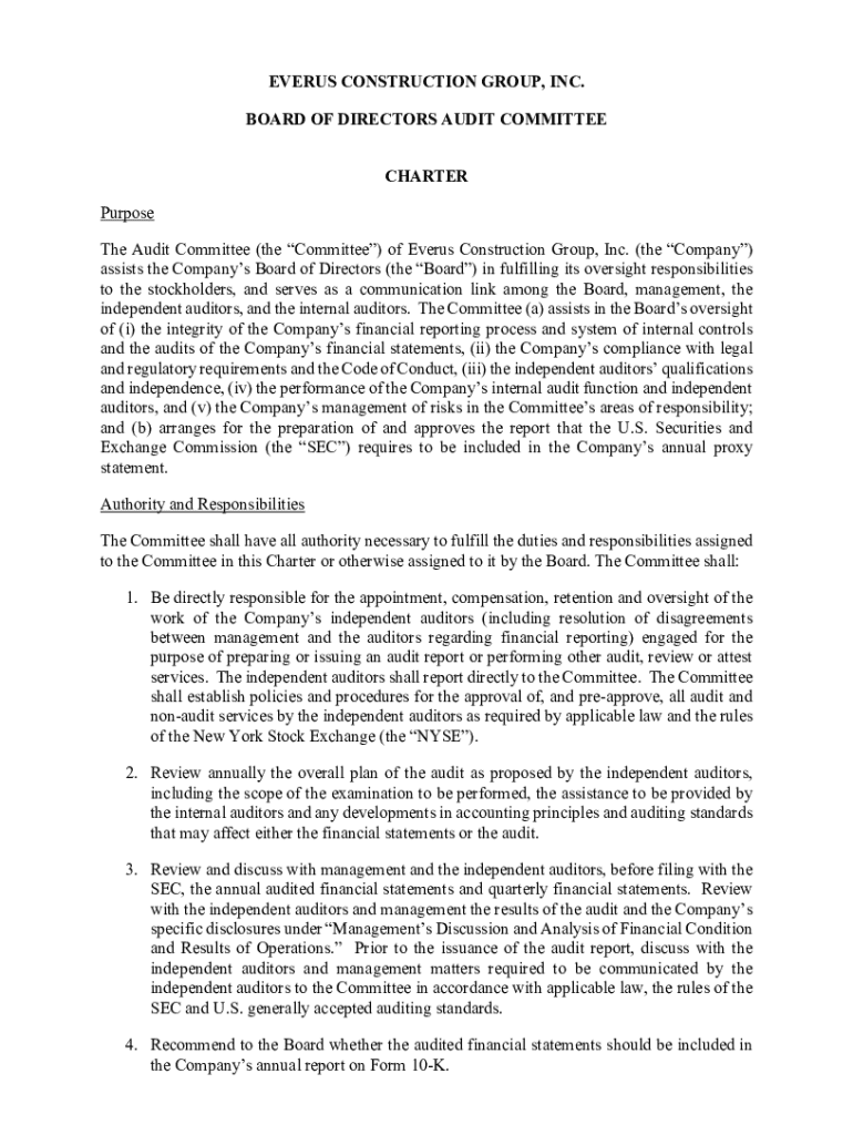 This document outlines the purpose, authority, and responsibilities of the Audit Committee of Everus Construction Group, Inc., including its oversight duties related to financial reporting, internal