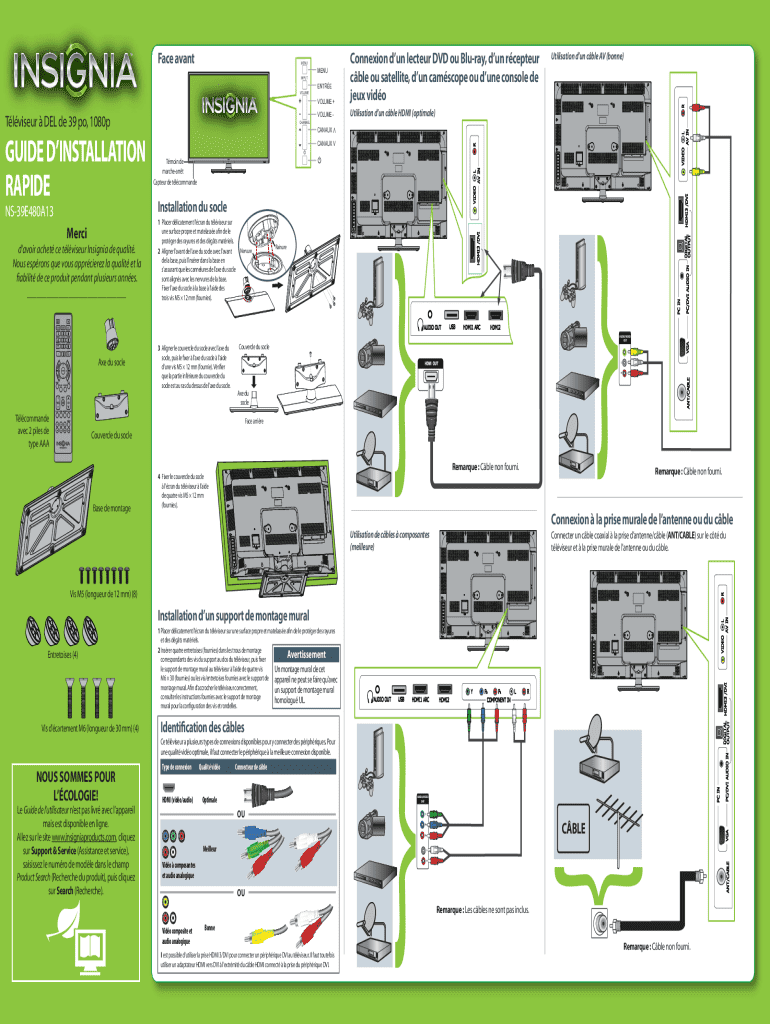 Ce document fournit des instructions sur l\'installation et la configuration d\'un tlviseur DEL de 39 po Insignia, y compris les connexions, l\'utilisation de la tlcommande et les paramtres de configuration.