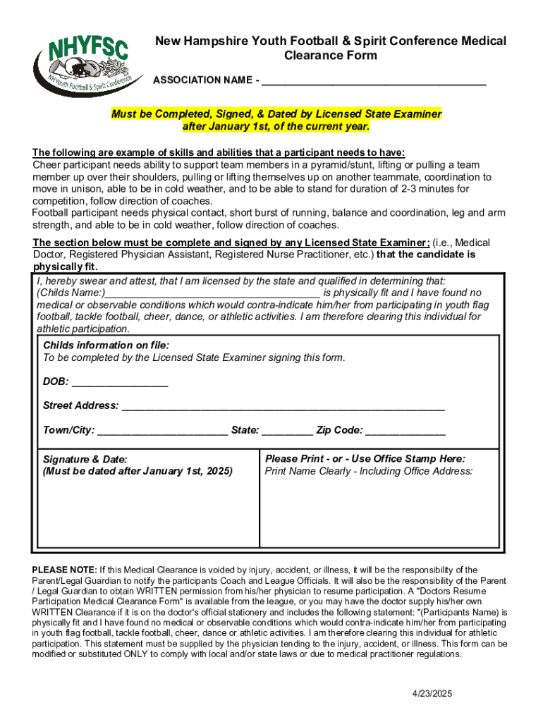 Get the free New Hampshire Youth Football & Spirit Conference Medical Clearance Form