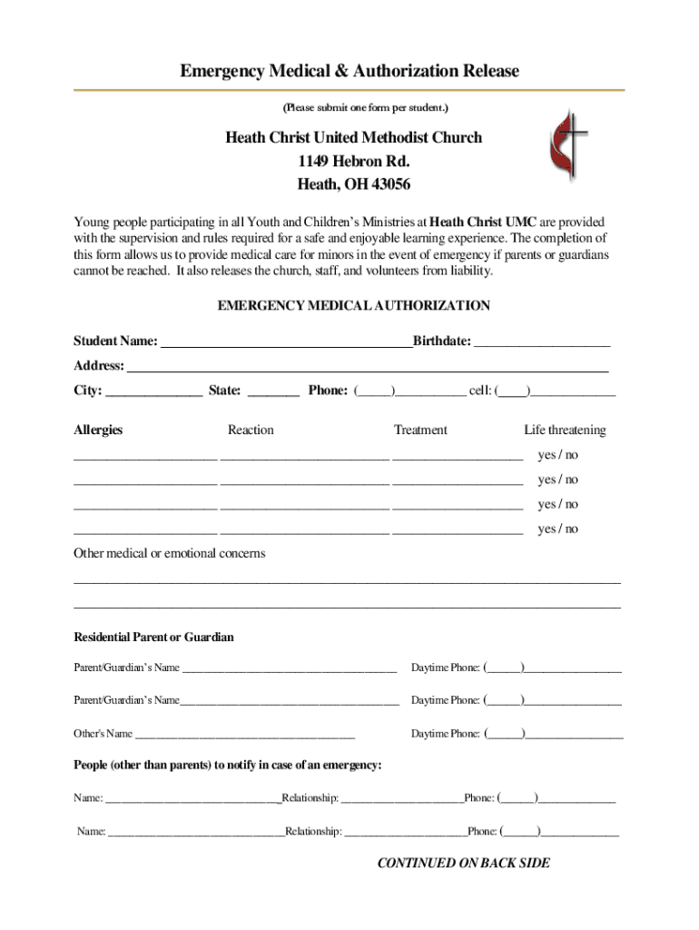 This form allows for medical treatment of minors in emergency situations during Youth and Childrens Ministries at Heath Christ UMC, and releases the church and its personnel from liability.