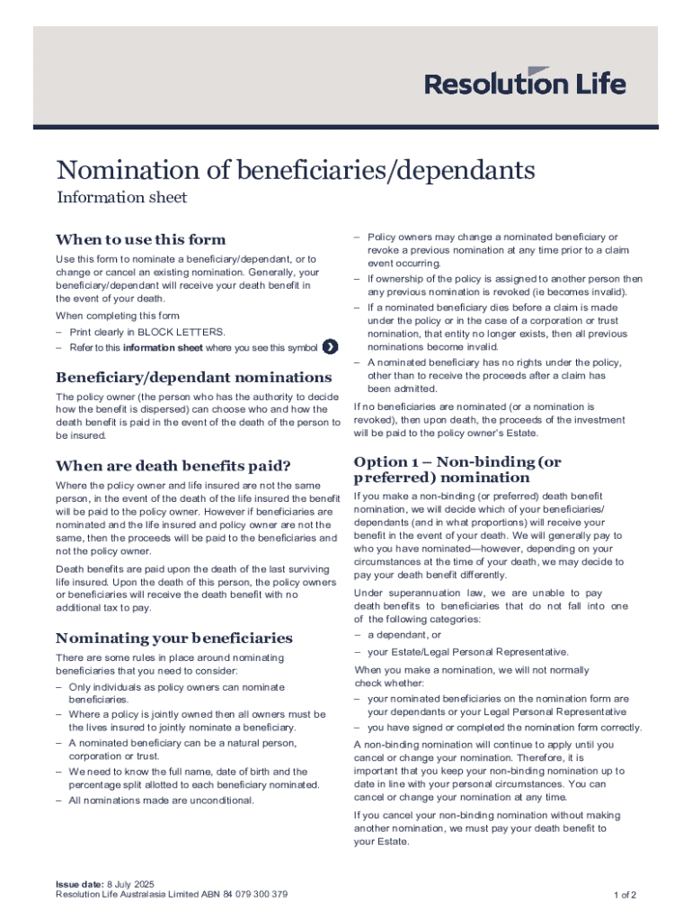 When considering the nomination of beneficiaries/dependants form, you should understand the differences between binding and non-binding nominations. A binding nomination legally obligates your super fund trustee to pay your nominated beneficiaries exactly as stated. Conversely, a non-binding nomination simply indicates your wishes but allows the trustee discretion over the distribution of your assets, potentially leading to varying outcomes.