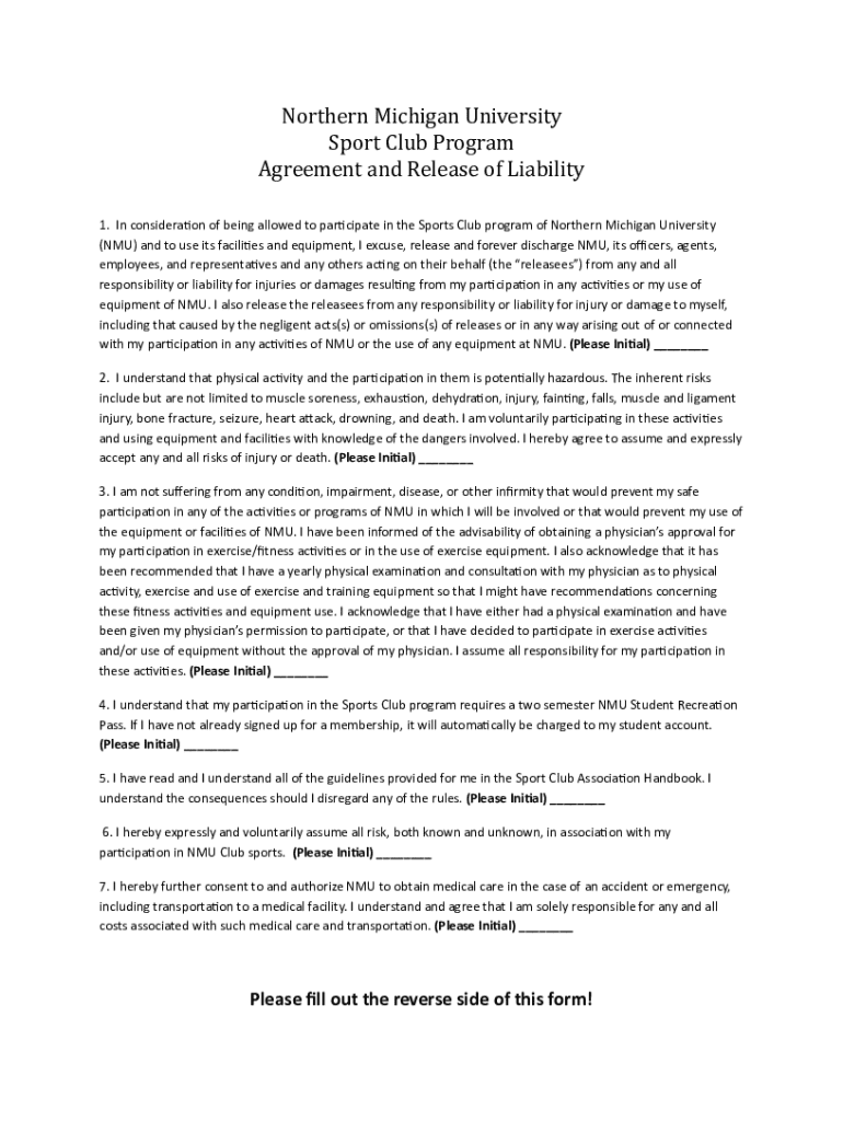 Get the free Northern Michigan University Sport Club Program Agreement and Release of Liability