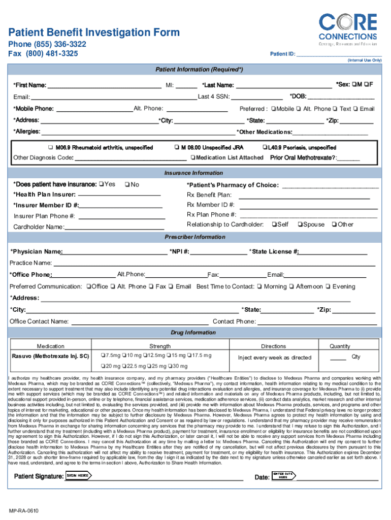 The patient benefit investigation form is a document used to assess the financial and insurance coverage options available to a patient for specific medical treatments or services.