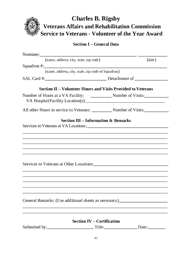 Instructions for the form Service to Veterans - Volunteer of the Year Award
