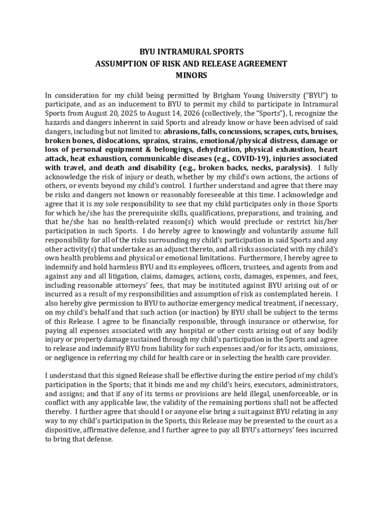 Get the free Byu Intramural Sports Assumption of Risk and Release Agreement Minors