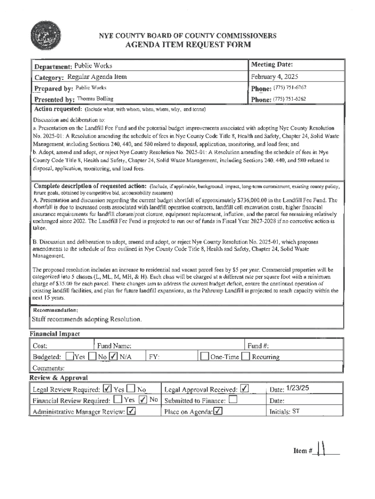 Get the free Nye County Board of County Commissioners Agenda Item Request Form