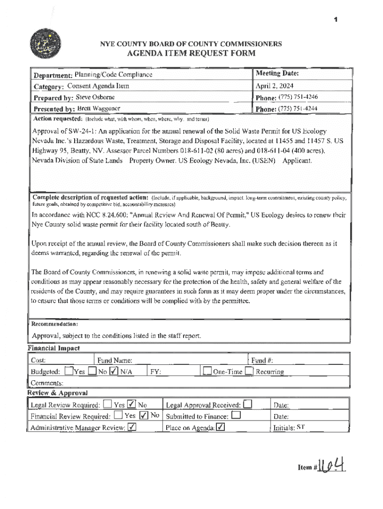 Get the free Nye County Board of County Commissioners Agenda Item Request Form