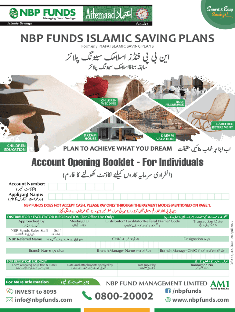 This document is a complete account opening booklet for individuals wishing to open an Islamic savings account with NBP Funds, detailing required information, investment plans, and terms and conditions.