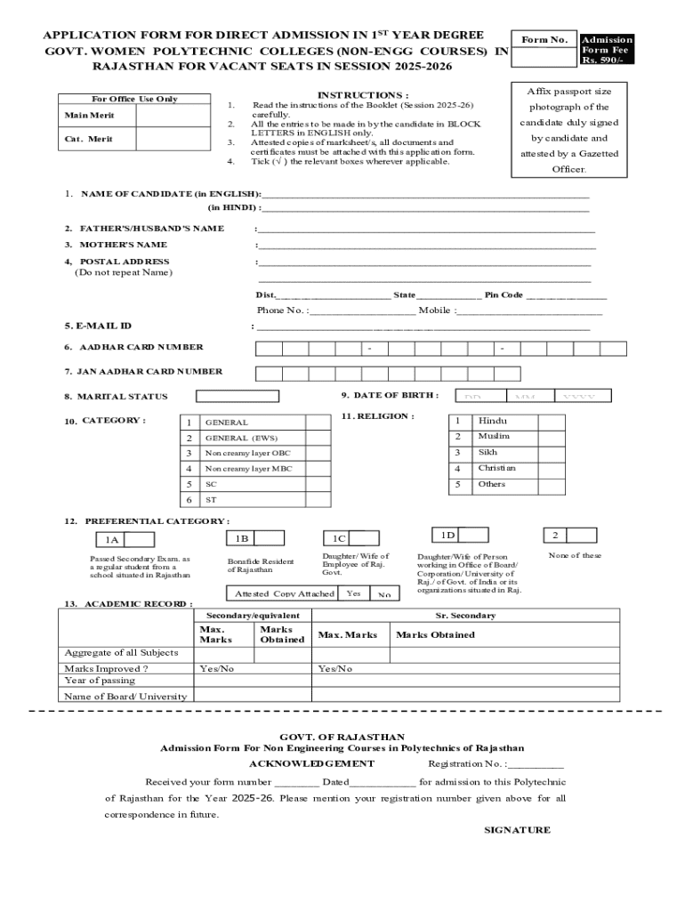 Get the free Application Form for Direct Admission in 1st Year Degree