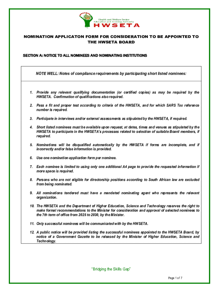 Get the free Nomination Application Form for Consideration to Be Appointed to the Hwseta Board