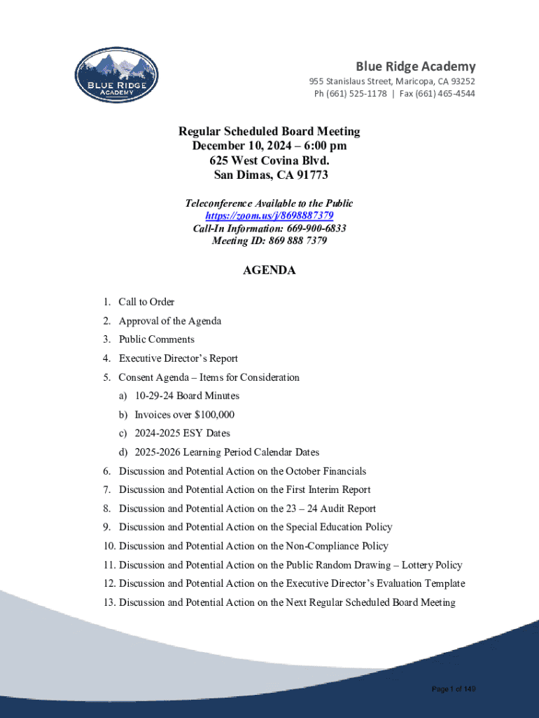Blue Ridge Academy955 Stanislaus Street, Maricopa, CA 93252 Ph (661) 5251178 | Fax (661) 4654544Regular Scheduled Board Meeting December 10, 20246:00 pm 625 West Covina Blvd. San Dimas, CA 91773 Teleconference
