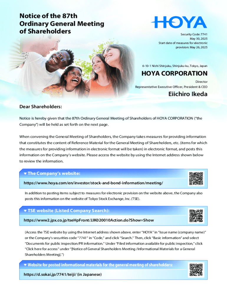 This document serves as a formal notification to shareholders regarding the upcoming 87th Ordinary General Meeting, including details about the meeting date, location, agenda, and instructions for