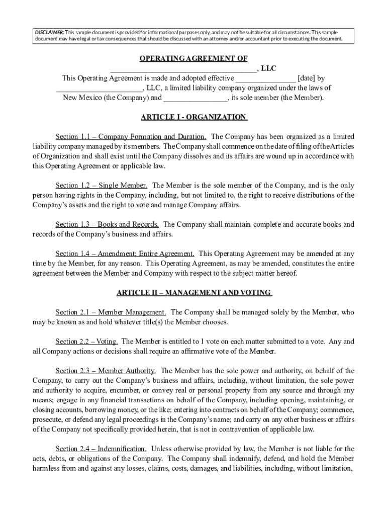 While New Mexico does not legally require single-member LLCs to have an operating agreement, it is highly recommended. This document outlines the structure of the LLC, describing how it will be managed and operated. An operating agreement is crucial for clarifying responsibilities and powers of the member, as well as delineating operational procedures.