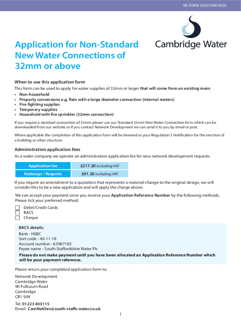 This form is used to apply for water supplies of 32mm or larger, applicable for various types of properties including nonhousehold, property conversions, and temporary supplies.