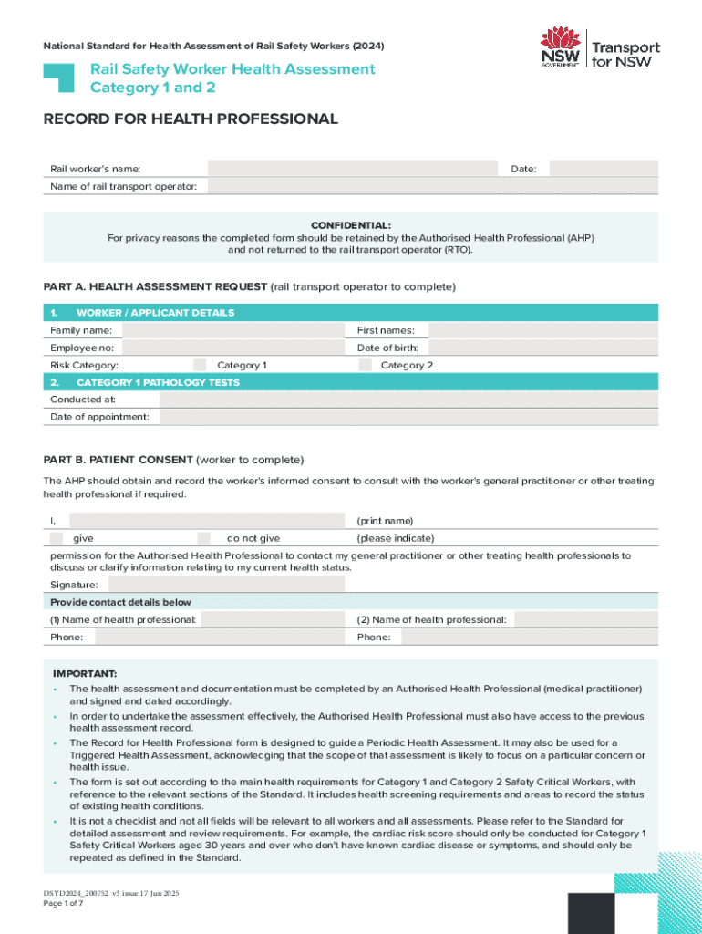 This document provides a standardized health assessment form for rail safety workers, detailing required health evaluations, consent forms, and confidentiality protocols to ensure comprehensive health