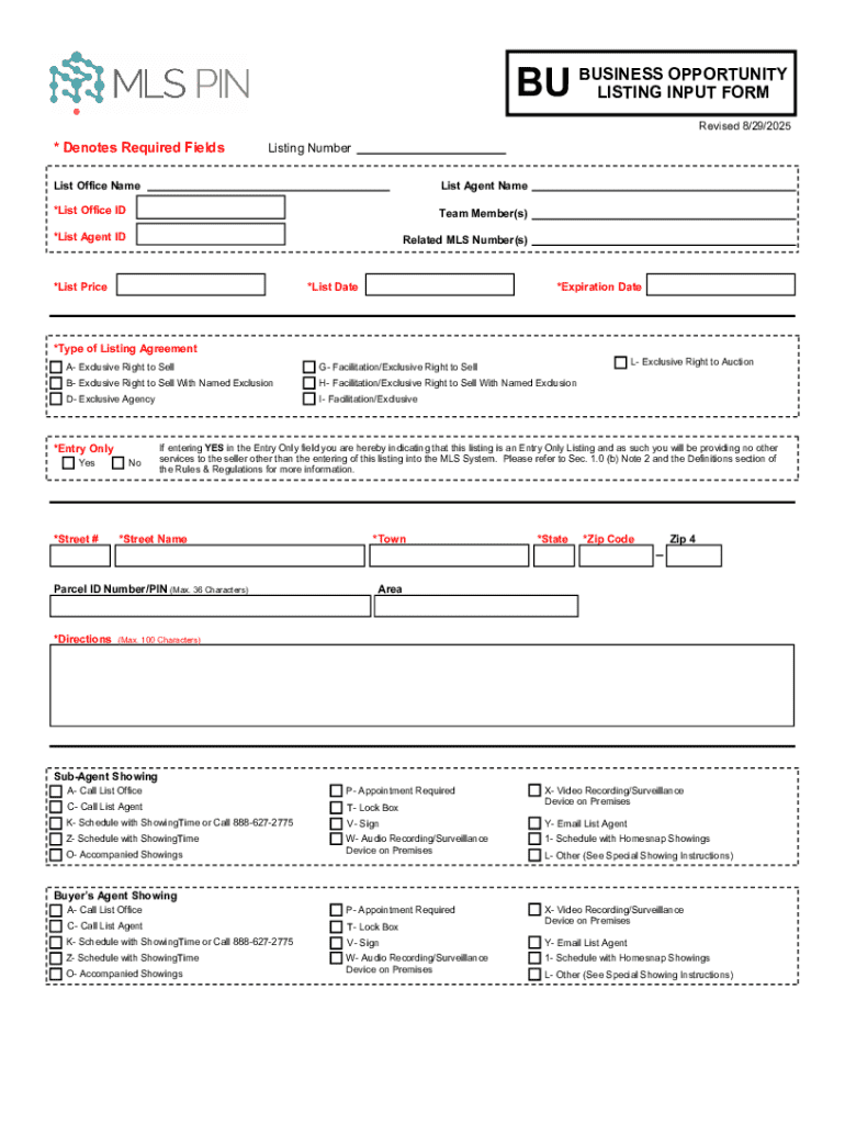 This document serves as a listing input form for business opportunities, detailing required information and options regarding various aspects of the listing and property.