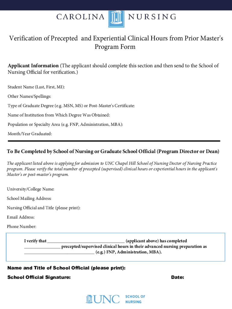Get the free Verification of Precepted and Experiential Clinical Hours From Prior Master's Progra...