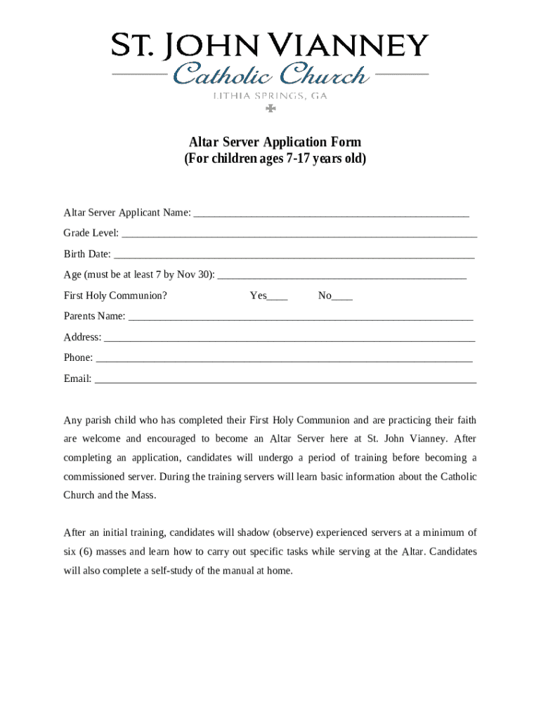 Key steps in the application process involve filling out the application template accurately, gathering necessary documentation, and signing the form. Each of these elements plays a crucial role in ensuring that the application is processed efficiently and that the altar server candidate is prepared for their responsibilities.