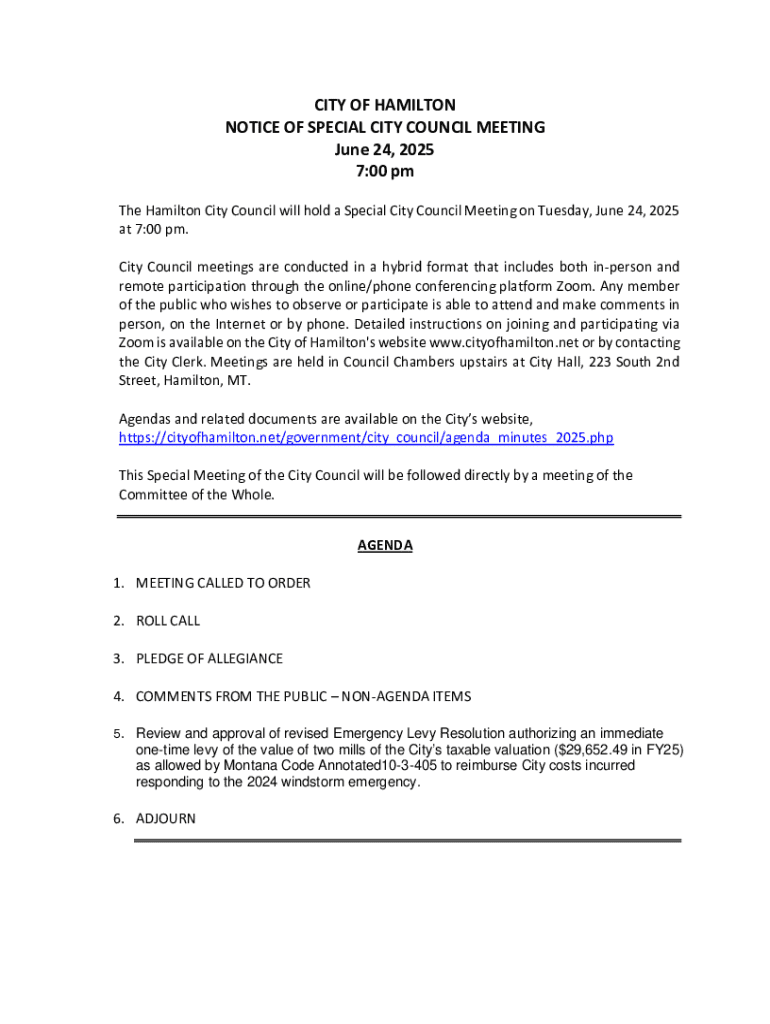 This document notifies the public of a Special City Council Meeting for the City of Hamilton, detailing the agenda, participation options, and a resolution for an emergency levy due to costs incurred