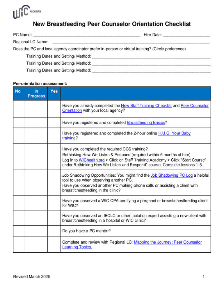 Get the free New Breastfeeding Peer Counselor Orientation Checklist