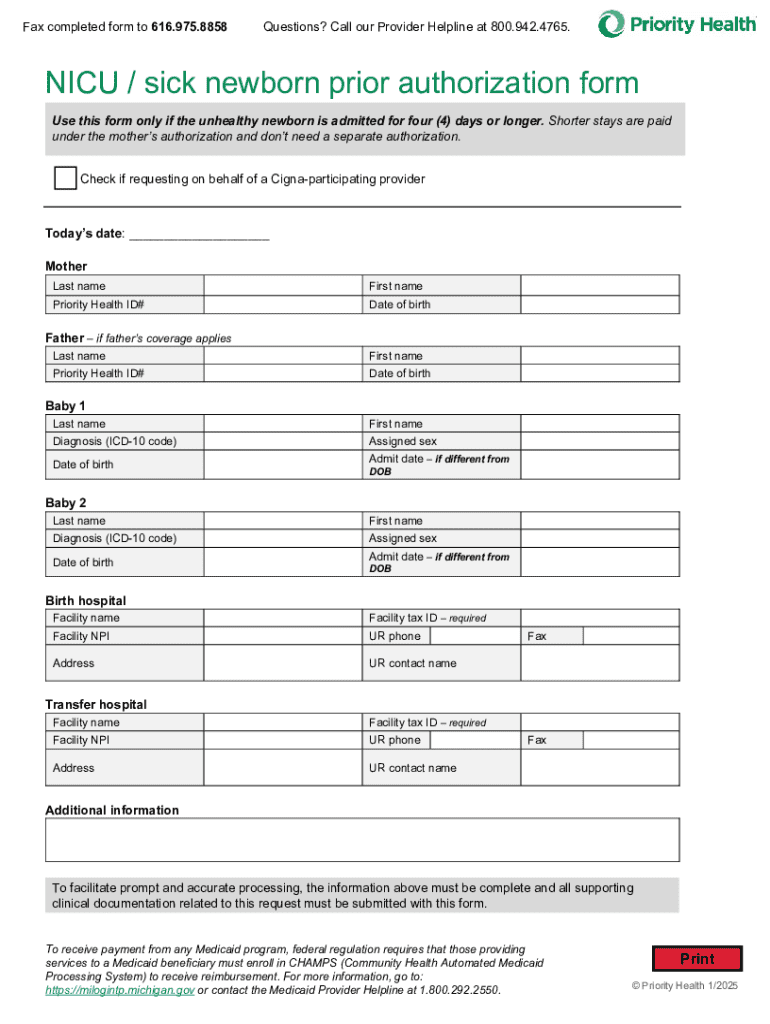 The NICU Sick Newborn Prior Form is aimed at various stakeholders, including families, caregivers, and medical professionals involved in the care of sick newborns. For families, understanding the form can empower them to be active participants in their child’s care. They can provide critical information about their newborn's medical history and express any concerns or observations that may be relevant.
