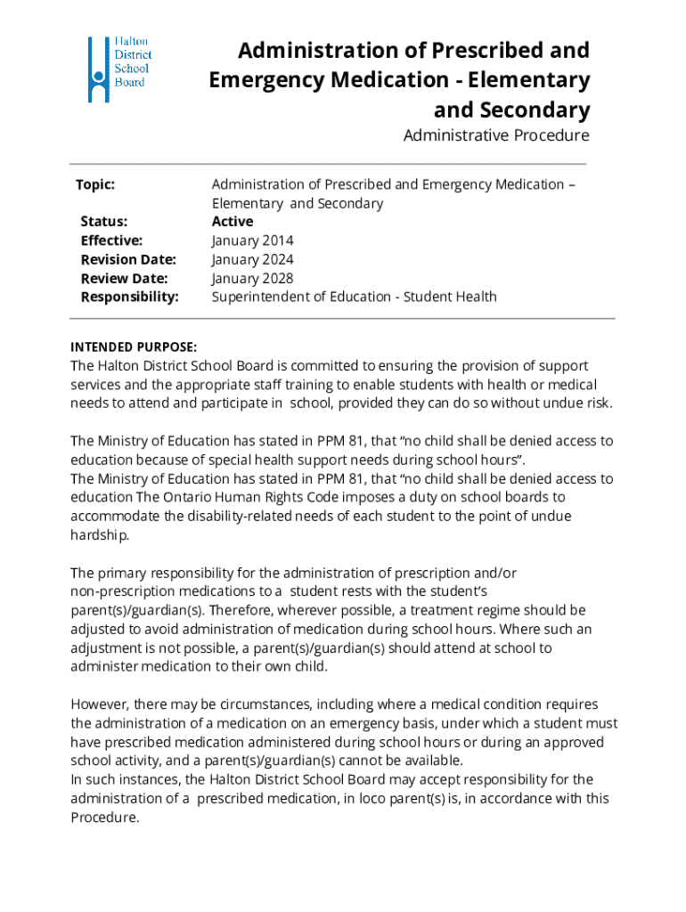 Get the free Administration of Prescribed and Emergency Medication - Elementary and Secondary Adm...
