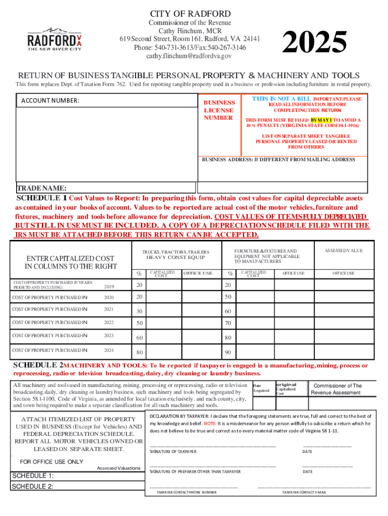 VA Return of Business Tangible Personal Property & Machinery and Tools - City of Radford 2025-2026 free printable template