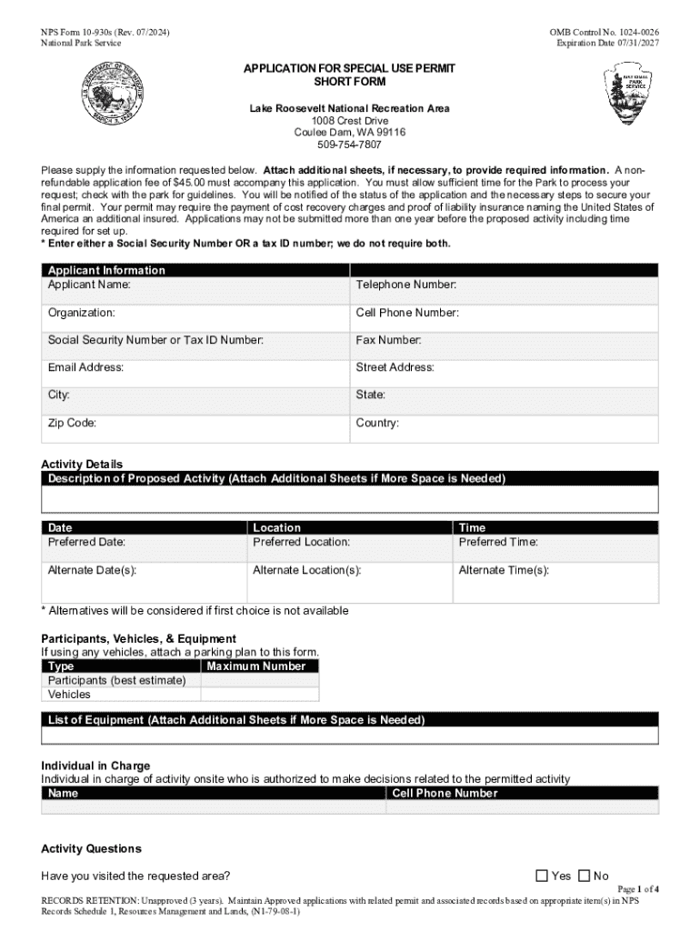 This document serves as an application for a special use permit at the Lake Roosevelt National Recreation Area, requiring details about the applicant and the proposed activity.