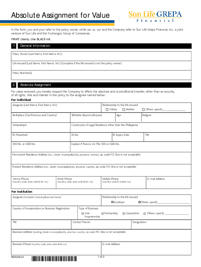The absolute assignment for value form has practical applications in various contexts, both personal and business-oriented. For instance, in personal finance, individuals might use this form to transfer rights to a life insurance policy as part of estate planning.