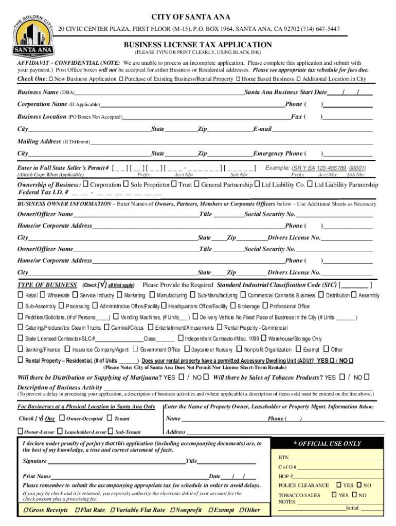 This document serves as an application form for obtaining a business license in the City of Santa Ana, including details for new businesses, purchases of existing businesses, homebased businesses,