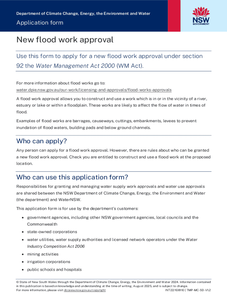 The new flood work approval form is an essential document required for any activities that may affect flood-prone areas. By mandating this form, regulators aim to ensure that all flood management efforts are conducted in a safe and compliant manner. The importance of obtaining this approval cannot be overstated; it protects not only the environment but also the communities that reside in these vulnerable areas. Without proper regulation, flood risk could increase, leading to devastating impacts on lives and property.