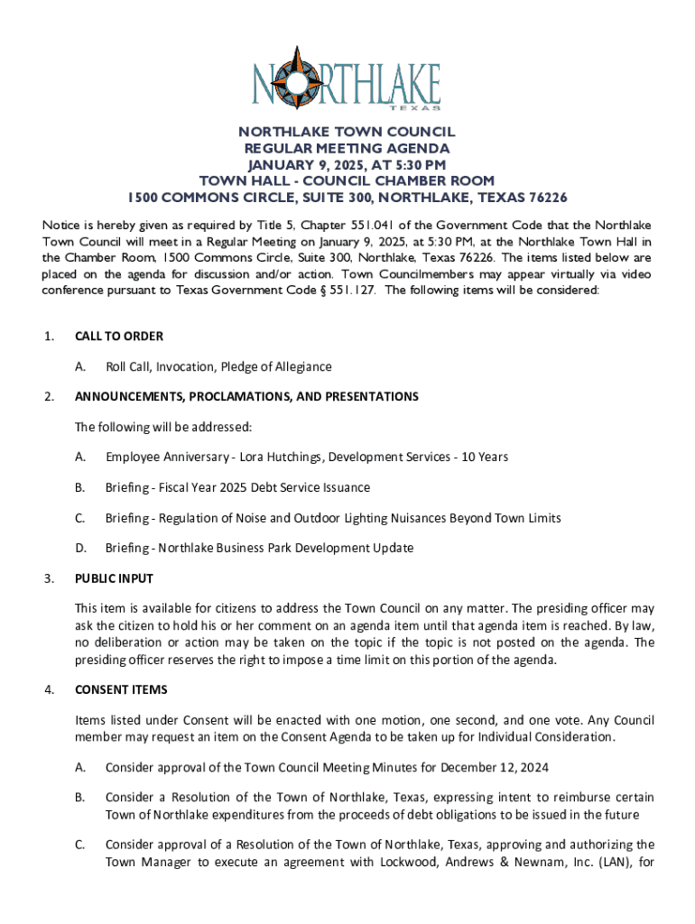 Get the free Northlake Town Council Regular Meeting Agenda