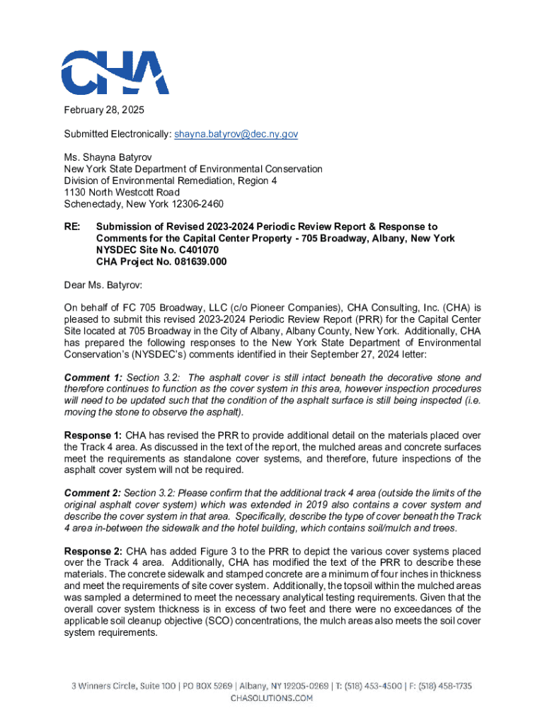 This document contains the revised 20232024 Periodic Review Report for the Capital Center Property in Albany, New York, which summarizes the inspection results, compliance with institutional and engineering