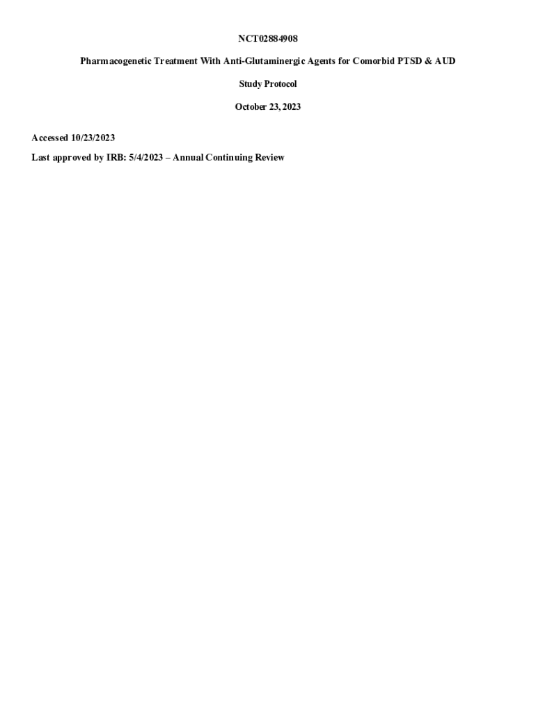 This document serves as the study protocol for a clinical trial investigating the efficacy of pharmacogenetic treatment using antiglutaminergic agents, specifically , in individuals with comorbid