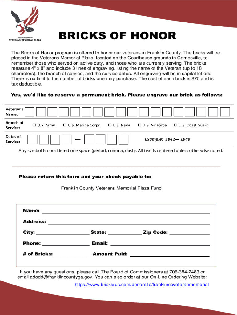 The Bricks of Honor Form welcomes participation from individuals, families, and organizations. Whether you represent a local business wishing to honor a community figure or you're an individual looking to memorialize a loved one, everyone is eligible to submit a form. Specific requirements usually include providing accurate personal details, selecting engraving options, and ensuring timely submission for your commemorative brick.