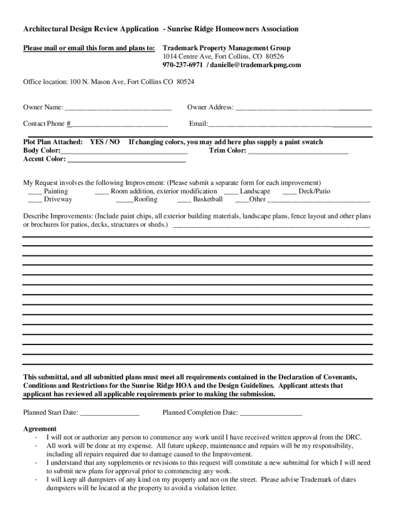 Furthermore, submissions typically require a site plan and detailed drawings, which visually represent the intended changes. These visual aids are crucial for decision-making, allowing board members to assess the impact of the modification on the community’s aesthetic. Lastly, documentation proving compliance with local regulations, such as permits or guidelines, is often required to ensure that modifications are lawful.