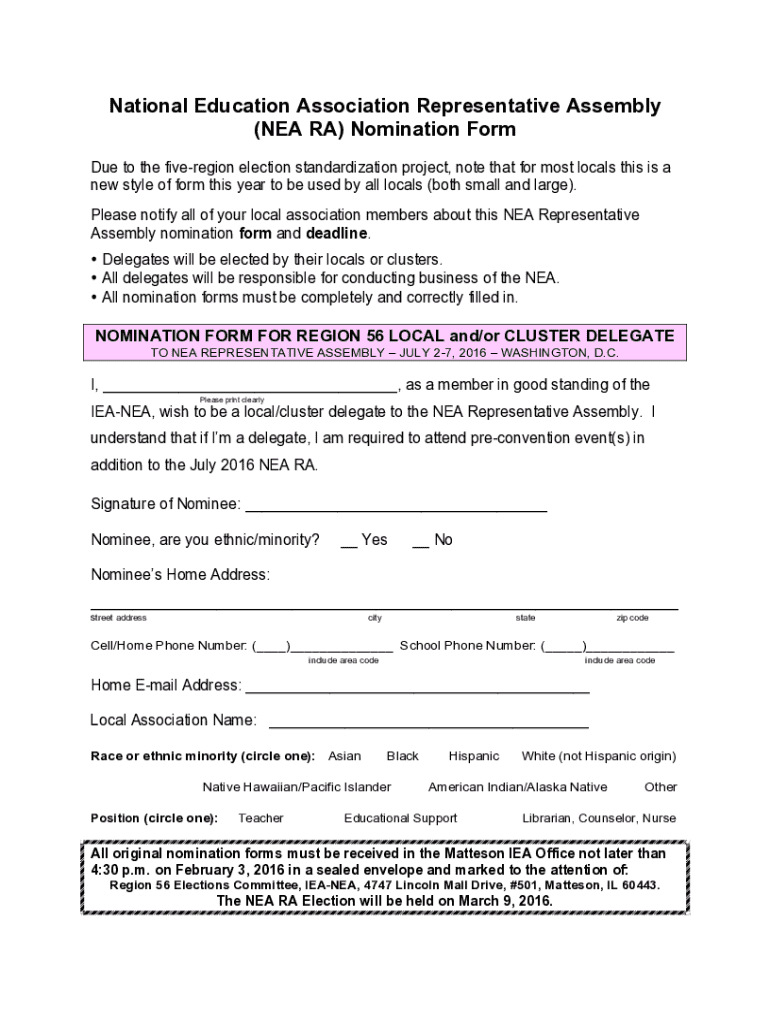 Once the nomination form is completed and reviewed, the next step is submission. Adherence to deadlines for submitting the nomination form cannot be overstated, as late submissions could disqualify potential candidates. Aspiring delegates should keep a close eye on all relevant dates communicated by the NEA.