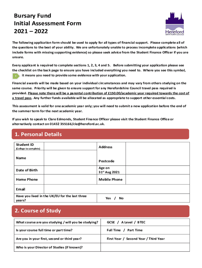 Get the free Bursary Fund Initial Assessment Form