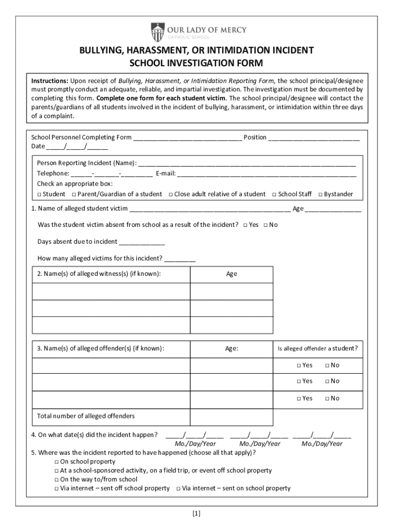Get the free Bullying, Harassment, or Intimidation Incident School Investigation Form